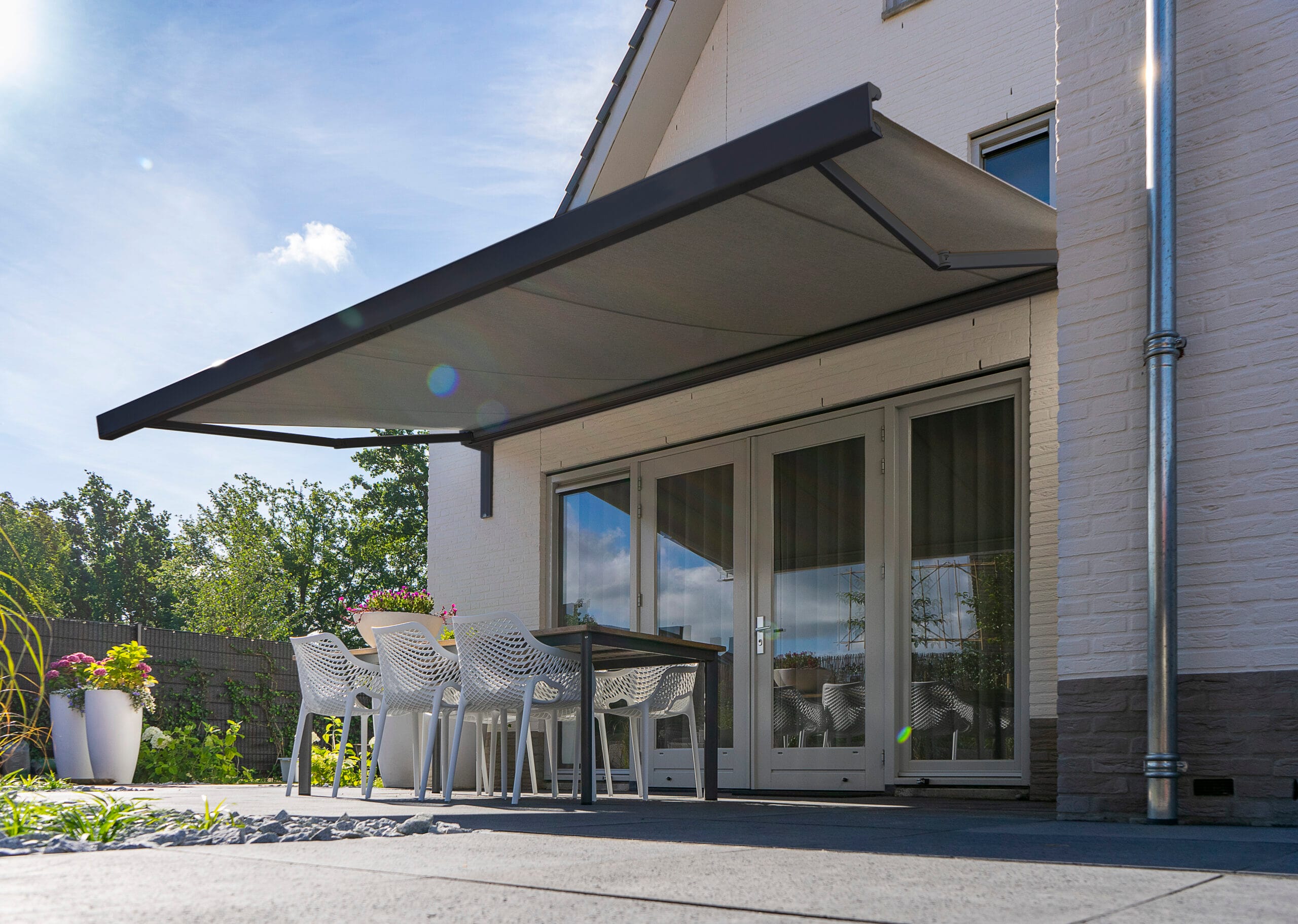 Een knikarmscherm klapt horizontaal uit met armen onder het doek. Hierdoor kunt u vrij onder het scherm doorlopen. Dit type zonwering is ideaal voor een terras of tuin.